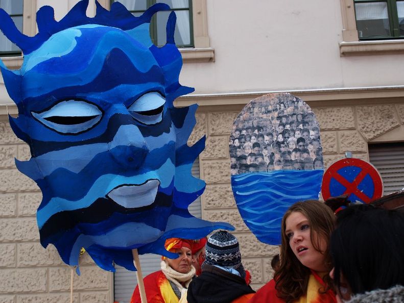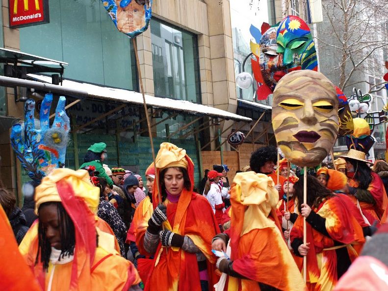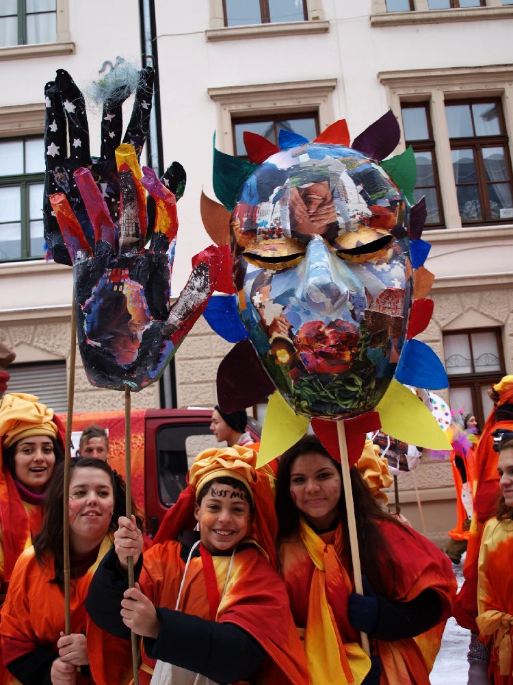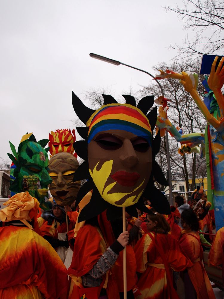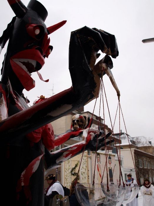 Neben den traditionellen Masken hatten Juise und Feba das Konzept für zwei Großfiguren mitgebracht, die als Kalis - Gottheiten mit zehn Armen - das Gute und das Böse darstellten. Schon die Herstellung der Masken und Figuren mit einfachsten und umweltschonenden Mitteln war beeindruckend. Dazu paßte, dass die Figuren nicht von motorisierten Fahrzeugen, sondern trotz ihrer beeindruckenden Höhe auf Fahrrädern transportiert wurden, die die Zweiradwerkstatt 180 Grad zur Verfügung stellte, was sogar auf schneeglatten Straßen erstaunlich gut funktioniert hat (www.zweiradwerkstatt180grad.de). Das Wurfmaterial der Gruppen kam von der Jecke Fairsuchung, die seit 2004 Süßigkeiten aus Fairem Handel im Rheinischen Karneval etablieren konnte.