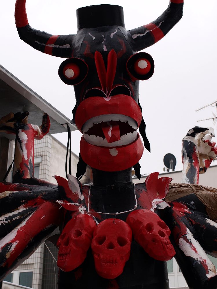 Die böse Figur - in den Farben rot und schwarz - wirkt sehr bedrohlich. Ihre Attribute sind ein bombembesetzter Flieger, ein Maschinengewehr, ein Totenkopf und die Erdkugel, als Zeichen für den von den Menschen bedrohten Planeten.